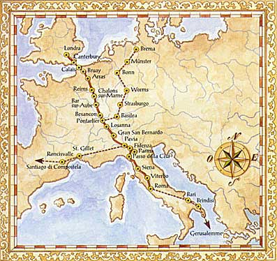 | Même si ce voyage n'est pas un pélérinage au sens strict du mot – le but n'est pas d'arriver au lieu sacré- cette route suit deux routes de pélérinage médiévales: la "Via Francigena", c'est à dire une partie de sa route d'accès allemande, ainsi que la "Via Flamina" à partir d'Assisi. Les pélérins et les commercants de jadis étaient de bon marcheurs et ils connaissaient les meilleurs chemins qui existent encore aujourd'hui en partie.