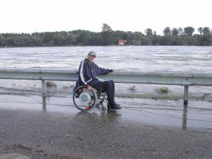 Anneliese und ich fuhren durch die schöne Stadt Lauterbourg und dann auf grün markierten Radwegen durch das Gewerbegebiet und einen großen Kreisverkehr hinaus. Hier lernte ich gleich, das Kiesgrube, wörtlich aus dem Französischen übersetzt, "Ausbeutungsgebiet" bedeutet. Wir schlugen uns über die Industriestrasse zum Hochwasser führenden Rhein durch, wo wir so gerade die Uferstrasse trocken benutzen konnten. Nach einer Toilettenpause auf einem verlassenen Kinderspielplatz mit hoher Hecke darum, machten Anneliese und ich eine längere Pause auf einer Bank direkt am Wasser; es gab wieder Gewürzkuchen und dazu Renekloden. Der Rhein bot einen beruhigende Sicht: viel glattes Wasser, einige Lastschiffe, diestromabvwärts mitschwammen, gegenüber am deutschen Ufer Schwäne, die das neue Hochwasserufer studierten und über allem blauweißer Himmel. Wir brachen nach einer halben Stunde wieder auf und suchten den Deichweg am Rhein, der zur europäischen Rad-Rheinroute gehört. Wir fanden den Weg bald, der gut recht beschildert ist, aber zu meiner Verwunderung häufig durch große Kiesereianlagen führt, woran wir uns jedoch gewöhnten. Wir fuhren zwei Stunden auf dem asphaltierten Deichweg, bevor wir aus zeitgründen abbogen, um nach einer Bahnverbindung Richtung Seltz zu suchen.