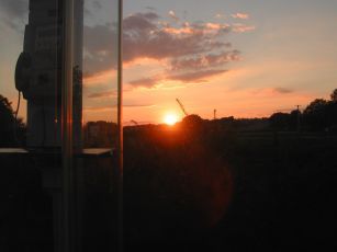 Da wir zwar zwei mal einen unmarkierten Reisebus mit einem schmucken Fahrer und einer jungen Frau vorne daneben durch den Ort fahren sahen, erkannten wir an den Haltestellen keinen Fahrplan. So liefen wir eben bis zum Ortsausgang und zur dortigen Bahnstation. Diese Station lag in einem Graben, und Anneliese stieg hinunter und las den Fahrplan. Heute fuhr kein Zug mehr nach Seltz. Das bestätigte uns auch ein älterer Herr, der mir zwar verneint hatte, dass er Deutsch spricht, dann aber mit Anneliese in gut verständlichem elsässischen Dialekt den öffentlichen Nahverkehr erklärte. Wir riefen deshalb Katrin auf der deutschen Seite an und baten sie uns abzuholen. Sie sagte, sie würde eine halbe Stunde brauchen, und so blieb uns nichts anderes, als uns den Sonnenuntergang zu beobachten - glaubten wir. Anneliese legte sich auf die Bank in dem neuen Blockhütten-Buswartehäuschen und schloss zur Erholung die Augen. Das Häuschen stand an einem Parkplatz, der wohl für den Friedhof nebenan gedacht war. Neben der Bushütte stand eine Telefonzelle. Wir beobachteten zu unserem Vergnügen, dass in unserer Wartezeit vier Autos auf dem kleinen Parkplatz anhielten, ein bis zwei Männer ausstiegen, in die Telefonzelle stiegen und meist lautstark telefonierten. Einer ließ während seines fünfminütigen Geprächs den Motor seines Wagens laufen, ein anderer fing nach dem Telefonat damit an, sein Auto von Müll zu befreien; zwei Handwerker waren dabei, die sich zuzweit an den Hörer drängten. Anneliese und ich blieben höfliche Gäste Frankreichs und dachten uns die jeweiligen Inhalte der Anrufe aus.