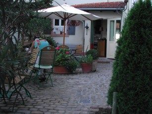 Als die Sonne spätnachmittags nicht mehr ganz so heiß brannte, bin auch ich Richtung Kehl-Stadtmitte, um nach einem Fahrradschloss, einem Speicherlaufwerk für mein Notebook sowie einem französischen Wörterbuch zu suchen. Der Einkauf war nicht so erfolgreich - ich konnte lediglich einen grünes Weiterbildungswörterbuch zur Abholung am nächsten Tag bestellen - doch ist meine etwa einen Kilometer lange Fahrt zur Einkaufsstraße war vielleicht die größere Erfahrung! Nie hätte ich vor Reiseantritt eine solche Solofahrt gewagt. Auch heute fährt ein Unfallrisiko durch Bordsteinüberfahrten, Bürgersteigschräglagen, unerwartete spastische Krämpfe, die mich aus dem Stuhl werfen können, oder durch Verkannten der Vorderräder an Wegspalten mit mir mit; auch ist mir nicht immer klar, wie gut ich von anderen Verkehrsteilnehmern gesehen werde (ein Kinderradfähnchen lehne ich strikt ab!) Ich bin dieses Risiko heute eingegangen, weil ich mir zutraute, meine Freiheit mit meinem Antrieb und den Erfahrungen der letzten Tage zu vergrößern. Es hat geklappt, und ich kam weiter als ich zuvor dachte! Wieder zurück am Hotel hatte ich nur das Problem, nicht den Eingangsschlüssel drehen zu können. Ich wartete einige Minuten in der von dem Leinöl der frisch behandelten Gastronomiestühle schwangeren, sehr warmen Luft auf den Hotel-Junior wartete, der an der Rezeption aushalf.