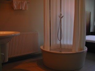 Ein anderes Zimmer - die schmucke, runde Duschwanne steht direkt neben dem Bett.