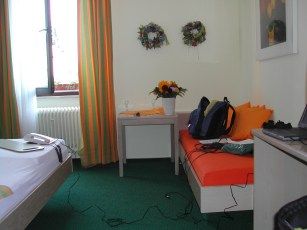 Ich telefonierte am Abend noch einige Male von meinem Zimmer aus mit Freunden und Familie, bevor Katrin und ich gegen acht unweit des Eiscafes, in dem wir gestern saßen, zu Abend aßen. Inzwische sind wir zurück; es ist ein lauer Sommerabend, und ich werde wohl bei offenen Fenster schlafen, obwol das Zimmer zur Straße hin liegt. Bereits jetzt ist es weit aufgerissen und die leichten, orangefarbenen Vorhänge, die so perfekt zur orange-grün-weißen Einrichtung passen wehen leicht im Wind.