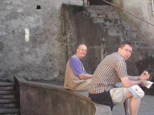 Zwei Männer neben der Pâtisserie und ein behütetes Knie.
