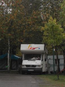 Wohnmobil unter Bäumen - leicht schief da brauchte ich die Beine nicht hochlegen.
