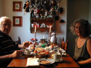 Zurück am üppigen Frühstückstisch bei Rogges. Nur heute nicht mehr auf der Terrasse, denn nach zwei Monaten ist es herbstlich kühl geworden.